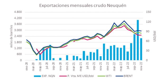 Durante noviembre de 2022, Neuquén exportó unos 2,23 millones de barriles de petróleo, representando 24% de la producción provincial, por cerca de 175,4 millones de dólares a un precio promedio que rondó 79 UDS/bbl. Así lo informó el Ministerio de Energía y Recursos Naturales, quien además detalló que fueron 12 las empresas que realizaron envíos, destacándose Vista Energy (851 mil barriles), Compañía de Hidrocarburos No Convencional S.R.L. (472 mil barriles), y Shell Argentina (430 mil barriles) cada una.